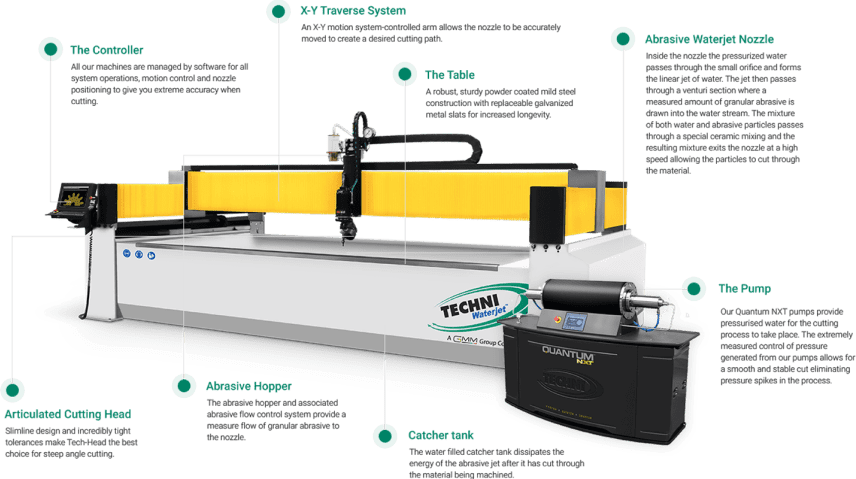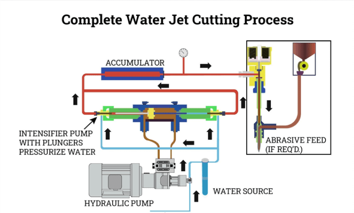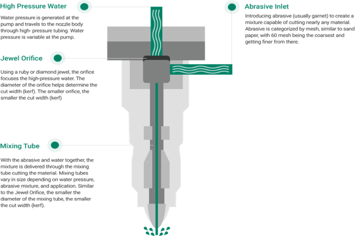 Waterjet cutter consists of three primary parts that work together to erode a narrow line within a piece of material using a high-pressure water stream. To improve the waterjet's cutting power, granular abrasive is added, contingent on the density and composition of the material (e.g., titanium). To enable a straightforward transition between cutting with only water and cutting with abrasive, the abrasive is added at the nozzle.
